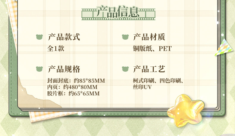 - Mini album dengan ukuran cover 85*85mm, inner page 480*80mm, film frame 65*65mm.
